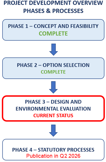 As part of the ongoing development of the project, non-intrusive visual surveys are ongoing accross the three study areas. The project is in the closing stage of Phase 3. Phase 4, through publication of the CPO, EIAR and NIS, will commence in Q2 2026.